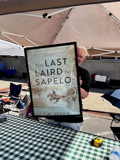 We have a great group of authors, including our past president, Mike Brown, whose latest release is The Last Laird of Sapelo, and here, his wife, Connie, who shares my love of antiques, is setting up a poster to promote his new book.