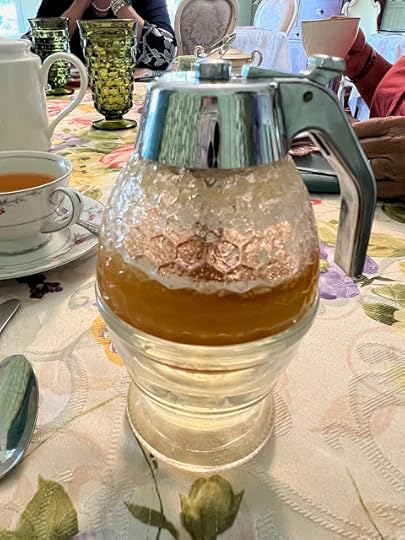 It's rare that I come across something new on a tea table, but this honey dispenser was so nifty that I asked if I could buy one to take home with me, and I was delighted that the answer was yes! (Both friends did so as well.) The teas I had were both quite tasty without honey, but as soon as I saw this gadget, I wanted to try it. The dispenser sits above a small bowl of hot water, and I could see immediately that this would be a great way to keep the honey pourable. One quick press of the handle and I had a little honey come out the bottom of the dispenser and into my teacup!