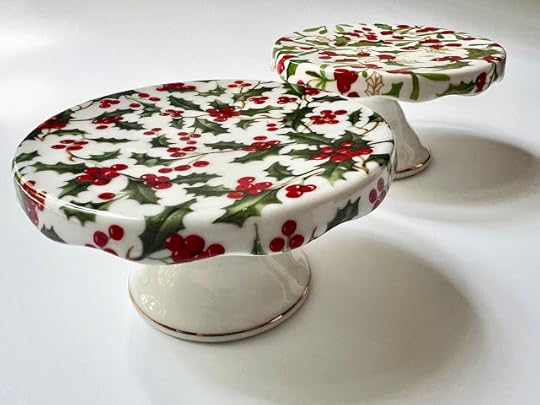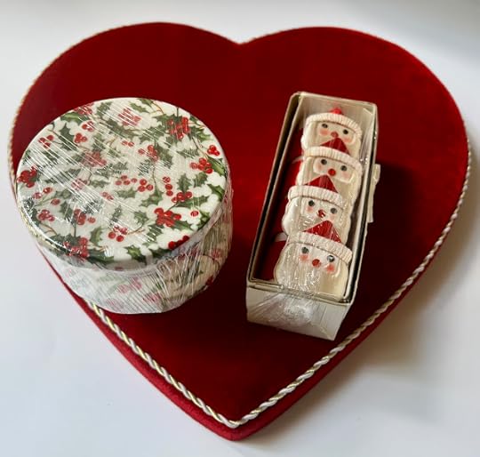 Did you know that tomorrow is Leon Day? Leon, of course, is "Noel" spelled backward, so we Christmas collectors like to celebrate Leon Day because it marks the halfway point to Christmas. For that reason, when I was at the Goodwill in Fayetteville on Saturday, I was happy to find some goodies I can use to decorate at Christmas. I am planning (and praying!) to make it as joyful as I possibly can, perhaps hosting a few teas for the many friends who have been so kind to me this year. The red-velvet heart-shaped candy box at back (just $1.09) is actually for my Valentine stash, but it occurred to me that a red velvet one might have a use at Christmas, too, so we'll see.