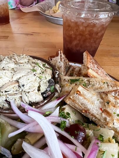 Berta ordered a panini that she said was very good, and I ordered the Red Grape Chicken Salad that came with grilled ciabatta bread, and it was great. The tea was every bit as delicious as I'd expected it to be, and the chunky chicken salad was so filling that I took over half of it home and had it for dinner that night. (I've also learned that bread reheated in a toaster oven is a lovely thing.)