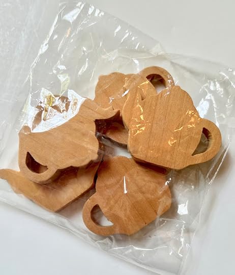 And the gift I couldn’t wait to share with you was something I’ve never seen before, these tiny little wooden teapots to use in crafting! Each one measures 2 inches wide and 1-1/4 inches tall. Kathy said I could embellish them with designer paper, and that was one of my thoughts, too, but I’m also thinking each one could become a pendant or a pin. I know you tea lovers will probably have some ideas as well, so what would you suggest?