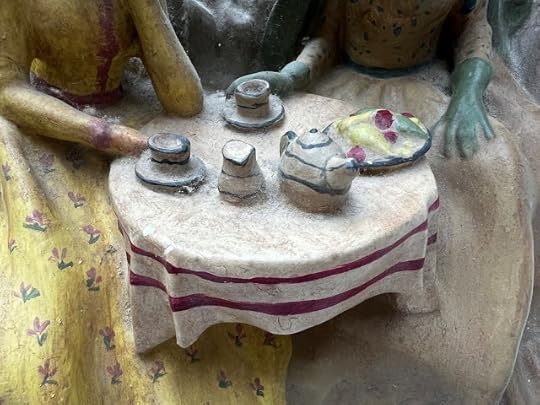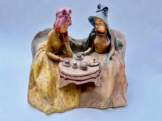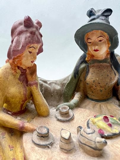 Dorothy said she's at the stage of life where she’s trying to get rid of things (I need to be doing that, too, I suppose), and I believe she said she found it at one of our Atlanta-area antique markets. She joked about a little dust that came with it, but I’m a bit nervous about cleaning an old figurine like this, so before I apply any soap and water, I’m researching chalk ware to make sure I don’t do any damage. I especially love the ladies’ bonnets.