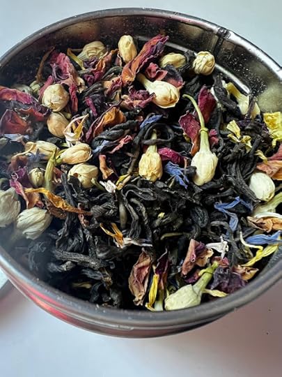 This jasmine tea blend contains jasmine tea, rose petals, jasmine blossoms, marigold petals, and blue cornflower petals, a lush-looking combination that made me eager to try it, especially since I love jasmine-flavored teas!