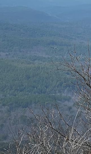 A helicopter! It appeared to have picked up a large red box-shaped something or other way down below, and we agreed it seemed highly unusual to be looking *down* on a helicopter in the air!