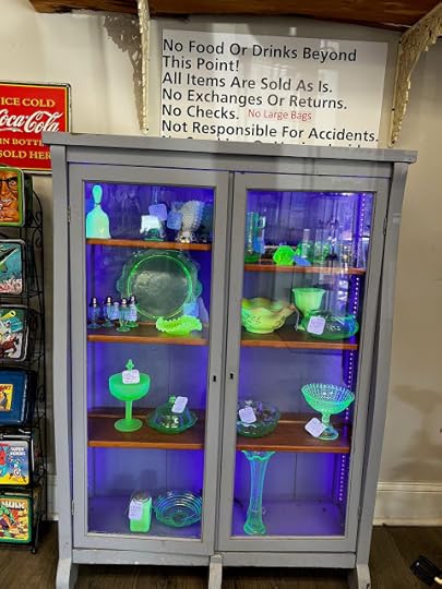 We stopped at several stores along the way, including a couple of thrift shops, one of which appeared to be open but was closed (lights on, cars lined up out front) and one of which appeared super junky outside but inside was one of the nicest, most well-organized thrift stores I've ever been in. Didn't buy anything there, but it was fun to look. Then, Alex spotted an antique mall near Lake Wedowee. The first thing I saw inside was a nice display of uranium glass, which my friend Connie has asked me to be on the lookout for. And what did I buy for myself?