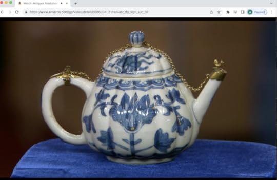 Learning about any antique object or artwork is interesting to me, but I was delighted to see a teapot appear on screen (this is a screen grab from my computer). According to this lady's aunt, the teapot was brought to Holland by the Dutch East India Company and was said to be a forerunner of the Delft Blue wares that are so popular today.