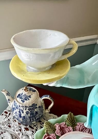 And I love him! From his turquoise suit and cheerful yellow teacup …