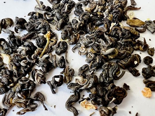 I started with the Jasmine Bi Luo Chun tea, which is scented three times. Did you know that "bi luo chun" literally means "green snail spring"? Those tiny little snail-shaped tea leaves are always fun to behold—and although I've eaten snails before, precisely once, I am pleased that there are no snails in this tea! If you're not familiar with the process by which jasmine tea is scented, you can visit this page to learn more. I've seen videos online about the scenting process, and I'm always impressed at the time and care it requires. (And at night, according to iTeaworld. If I ever knew that, I'd forgotten it.)