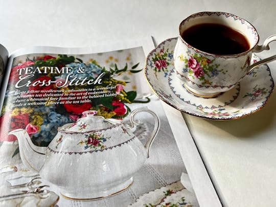 The article on "Teatime and Cross-Stitch" in the March/April issue immediately became one of my all-time favorites. Why? Well, because it features the Royal Albert Petit Point pattern, and I have several pieces (but not the teapot, for which I'm simply unwilling to pay full retail, so holler if you see one for $5 at a thrift store!).