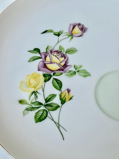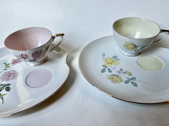 Made by Lefton, these snack sets are unusual in that each set is a different color, and the inside of the cup and the inside of the indentation feature the same pastel color of the teacup's flowers! I am quite smitten with these beautiful pieces and immediately made room for them in my kitchen cupboard.