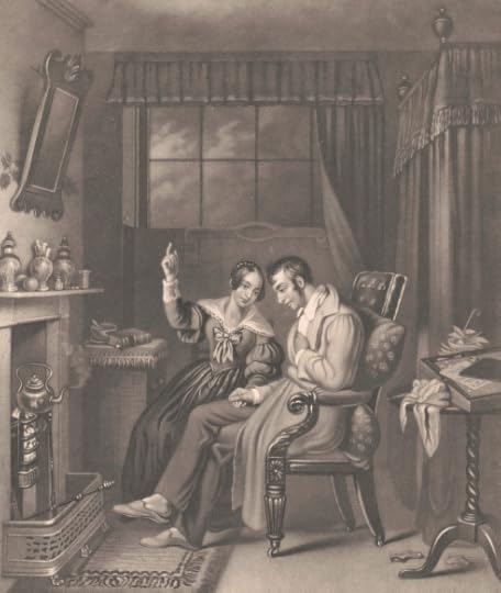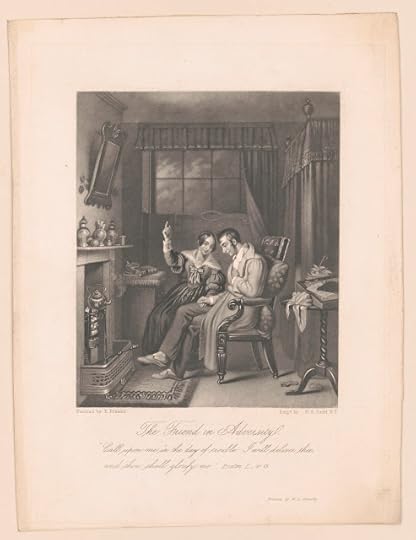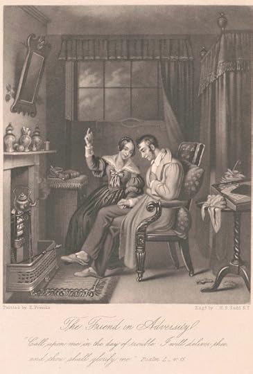 I hadn't stalked the Library of Congress for teatime images in a while, and this week, I found one that was a new discovery, "The Friend in Adversity," painted by E. Prentis (1797-1854) and with Henry S. Sadd listed as "engraver" and W. L. (Waterman Lilly) Ormsby (1809-1883) as printer. The Library of Congress Summary says this: "Print shows a man, possibly ill or otherwise in despair, seated in a chair before a fireplace in his bedroom, a woman sitting next to him, comforts him with kind words; a teapot steams in the fireplace and dark clouds pass beyond the window in the background."