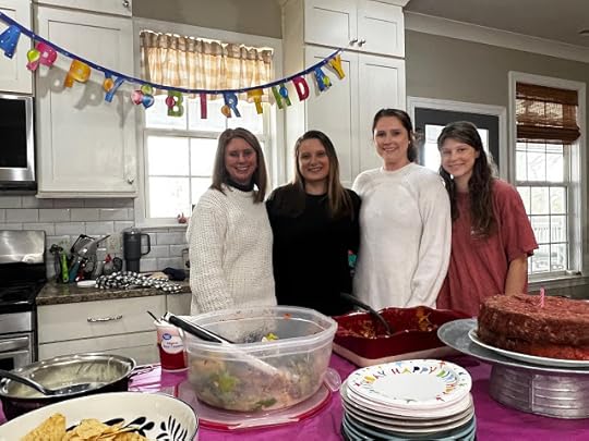 My niece Madison turned 28 on Saturday, and yesterday after church, the family met up at her mom's house for her birthday party. My sister made some tasty Mexican casseroles and salad and chips, and Daddy made a strawberry cake at Madison's request. From left are my sister, Rhonda, and nieces Cari, Madison, and Amelia.