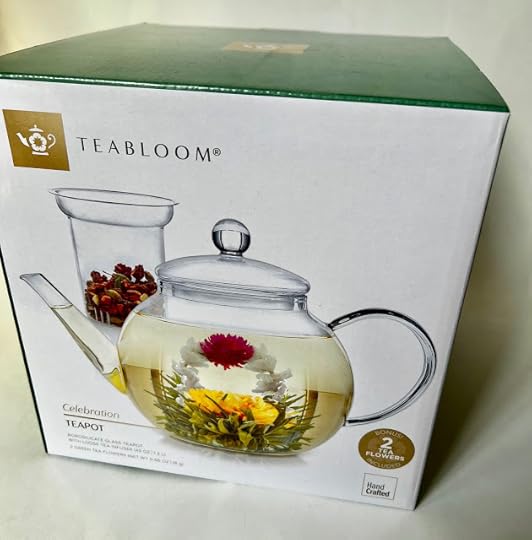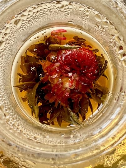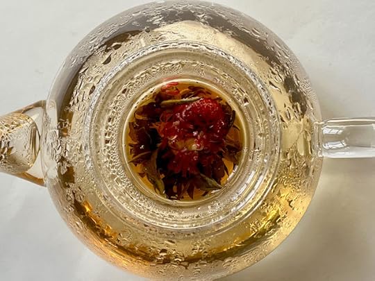 Of course, the real beauty of a glass teapot is that you can see those pretty blooming teas as they steep. I haven't had one of these teas in years, so again, I was delighted to be sipping this tasty Rising Spring tea flower with its refreshing jasmine flavor. I do believe this is the first time I've ever gone to someone else's birthday party and left with a gift for me! (And I kinda liked it.)
