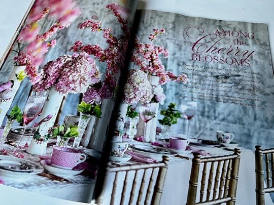 And the magazine is even prettier in the daylight, it turns out, and it's such a tea-ish issue! Look at this gorgeous cherry blossom-themed table with that pretty pink Mottahedeh china.