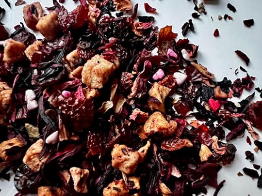 Look at this loose tea! You can see the rose hips and the fruit pieces, but do you see the tiny little heart sprinkles? Oh. My. Goodness!