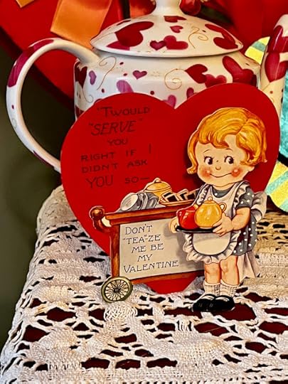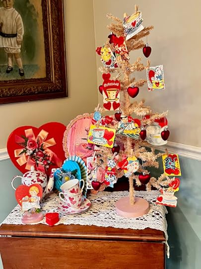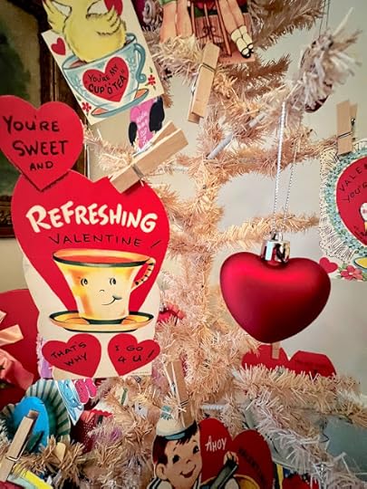 I pulled out my pink faux feather tree as well and clipped some of my tea-themed vintage valentines to it.