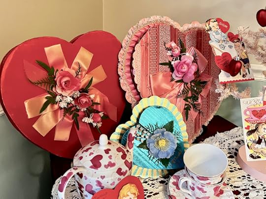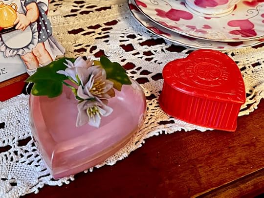 And I know these boxes once held candy! The local antique stores didn't turn up a single vintage heart-shaped candy box this year, but I did find the red one here for $10 on Facebook Marketplace last year.