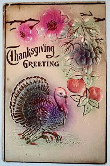 After I dropped off the frozen turkey at home and resumed shopping on that Saturday, I came across what I thought was a beautiful vintage turkey platter. It's got a pretty moss-green border that somehow softens the turkey.