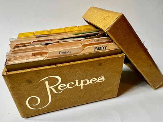 While browsing a local antique store the other day, I came across yet another of the vintage recipe boxes I love to collect (when they're cheap!), and this $3.50 cardboard model fit the bill. I prefer the old metal recipe boxes, but since the price was so good, I decided to add this one to my growing collection. I have so much fun poring through the old recipes and trying to conjure up the woman who once cherished them.
