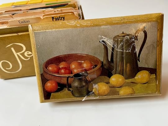 I wish sellers wouldn't tape their prices atop the graphics of old collectibles. I've had books and other items lose part of their image this way, but again, this time, I was interested in the old recipes more than the box itself, so the tape remains on this box's padded lid.