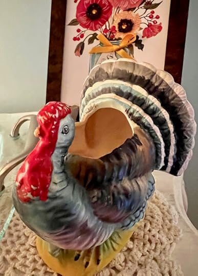 Here's a close-up (a bit dark since it was gray and rainy yesterday and I had to photograph it indoors; sorry!). While I was happy to find this planter, I couldn't remember where I'd stored the other two vintage turkey planters I've had for years. Finally, I remembered that in my Christmas journal, where I jot things like gift lists and my Christmas card record, I had also started writing down Where I Stored Stuff each year. And lo and behold, I'd written, "Turkey planters-cardboard box that electric teakettle came in, bottom of bedroom closet." And that's right where they were! My goal this year is to get everything stored in clear plastic containers and in the garage. We'll see if that happens.