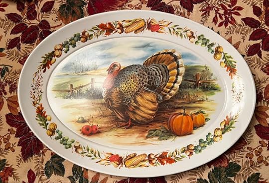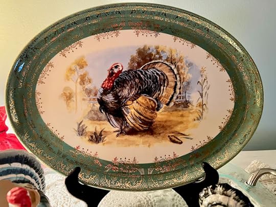 This past Saturday, I found yet another vintage turkey platter, a giant 16 x 20-inch plastic one, for just $5 at a thrift store. It was perfect for holding the turkey sandwich fixings that our family enjoyed on Sunday, and I like its kitschy quality, and I now consider it my "casual" turkey platter.
