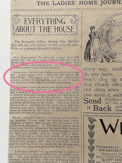 But when I started poring over it, I found a few things that I just couldn't bear to cut up, like this item on "high tea." It says, "Several hot dishes are served at a high tea. A hot supper and a high tea are almost the same thing. The supper may, of course, consist of a greater variety of substantials, and all sorts of water ices and ice creams may be served, also frappé." While I have given up on trying to persuade the world that "high tea" and "afternoon tea" aren't the same thing, that the former is a lowbrow meal and the latter is the fancy one, I still felt rather relieved when I realized this information required clarification even back in the late 1800s.