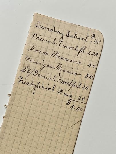 And one of the most inspiring finds of the whole packet was this tiny little 2 x 5-inch sheet torn out of the pocket notebook of some old saint of yesteryear. I was so inspired by his or her commitment to giving that I started keeping a "self-denial envelope" in my purse so that I will be reminded to think about the less-fortunate and perhaps count my own blessings a little more frequently!