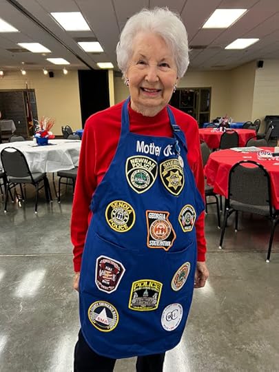 My friend Norma is the ringleader of this event. She's in her eighties and can run circles around the rest of us. She's considered "The Mother of Public Safety" in Coweta County, and several years ago, the local LEOs all contributed one of their official patches so that it could be sewn onto a special apron that she proudly (and I mean proudly!) wears at the luncheon each year.