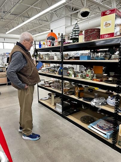 And y'all will swear that I forced him to take me to the big St. Vincent de Paul thrift store in Green Bay, but it was actually *his* idea! Here, he's checking some prices for me while I'm in a very long line.