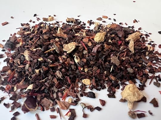 I love the way the loose tea looks, and the smell was delightfully rich. This blend contains honeybush, cinnamon bark, cardamom, ginger root, cocoa nibs, and safflower.