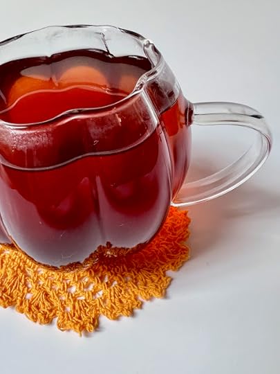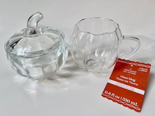 I will be hosting a tea later next week, so I headed to T. J. Maxx this weekend in search of some of those pretty cream-colored pumpkins with floral designs on them. They were all the rage last year, but alas, I didn't find a single one at T. J. So I headed next door to Michaels, and they didn't have any either, but they did have this cute pumpkin-shaped glass mug on sale for 60 percent off. It seems so fitting for my pumpkin spice tea!