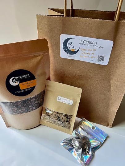 My husband and I traveled together to Lavonia, Ga., last weekend, and he stayed at the hotel while I met up with my craft retreat girlfriends during the day for crafting, shopping, and dining. Some of us gals had talked about going to an artisan festival in Hartwell on Saturday morning but decided against it. It turned out that Alex, who enjoys gallivanting on his own while I'm away, went to the festival himself the morning we were all out shopping elsewhere, and he surprised me by sending along a photo of the teas he'd just purchased for me as an early birthday gift! They included the Love Potion Tea and the Sleepy Time Tea from Hiyamoon Apothecary and Tea Shop, a new vendor to me, so a girlfriend and I ended up heading over to Hartwell after all!
