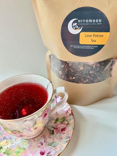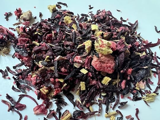 This Love Potion Tea is fabulous! I don't know what all is in it except for strawberries and hibiscus, but it's a wonderful blend, and I can definitely taste the strawberries. It also seems to have a glittery dusting of something or other on the tea, and since this company advertises their organic offerings, I'm assuming it's not glitter (or if it is, it's certainly edible). Their website just says strawberries and hibiscus, but boy, is it good. Not too tart and delightfully berry-flavored.