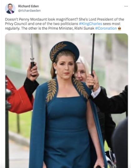 It's always fun to see what the women in particular wear at these Royal events, and this time, I was absolutely smitten with that gorgeous teal outfit worn by Member of Parliament Penny Mordaunt. (I originally typed "tea outfit." Freudian slip?) And did you catch the info from the Twitter post above? "She's Lord President of the Privy Council and one of the two politicians King Charles sees most regularly."