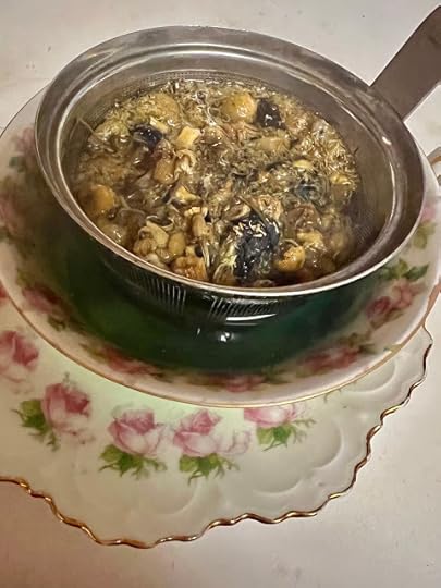 I hadn't yet tried the Sleepy Time Tea my husband got me for my birthday, so I decided it was time to give it a try. At first glance, the steeped tea looked rather like a typical chamomile tea blend.