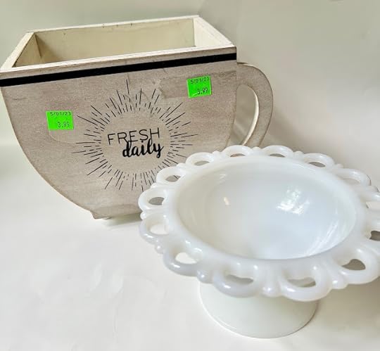 And I also found this cute little milk glass pedestal bowl that matches a platter I got at an estate sale last year. For $2.99, it seemed like a good buy and a worthy companion to a piece I'm already using. I've been too busy to do much thrifting lately, but these fun funds were certainly worth that five-minute shopping spree! May 17, 2023