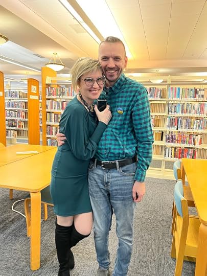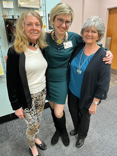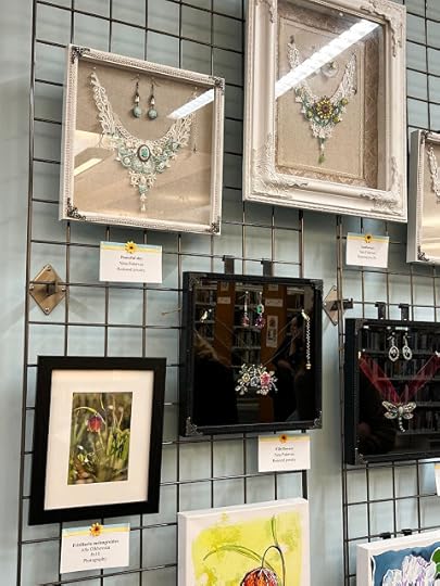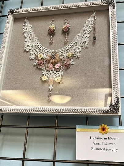 Two years ago, I was at a book signing in downtown Newnan when a beautiful young woman wearing a gorgeous rhinestone necklace stopped by the table. I asked to take a photo of her necklace, and I learned she was a Ukrainian woman now living and working here in the US, and she is also a jewelry designer! I explained that I write cozy mysteries about a jewelry designer, and before you know it, a mutual friend and I were having tea at the home of Yana and Yegor, and we've been friends ever since. So when she asked if I would help her write a few words of verbiage for an upcoming exhibit of her work as part of an art display titled “Ukraine in Bloom,” I was happy to help. When I got to the event, I wasn’t the only one wearing a "Yana original," as I was wearing a pearly dragonfly pendant-and-earrings set of hers I’d bought at a pop-up shop last year.