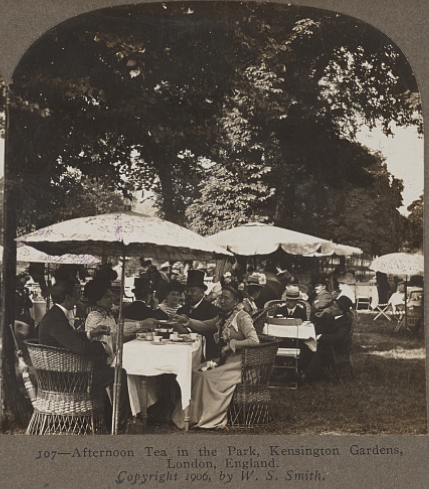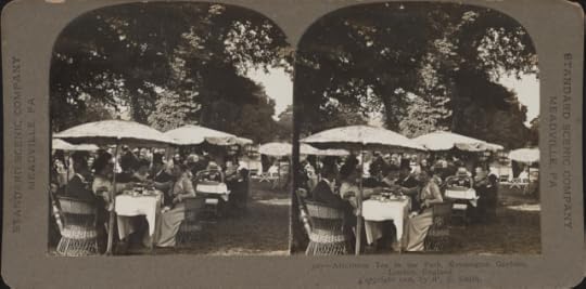 The Library of Congress website seems to have added a lot more tea images since I last pored over them. This one, a stereographic image from 1906, is titled "Afternoon Tea in the Park, Kensington Gardens, London, England."