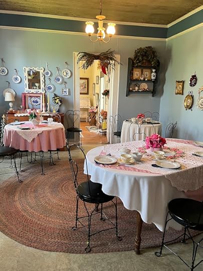 Last week, I had the great pleasure of attending one of the most delightful—and exclusive!—tearooms that I've ever been to! I've known Susan, a retired science teacher, for years now, and we go to church together. She'd mentioned that she sometimes hosts teatimes for friends at a little place out in the country that was once her husband's family home. I began to hear about this place from friends at church, and Susan even asked me to join them, but my schedule never worked out to visit until last Wednesday, and I was so happy to be able to join her and her Sunday School class for tea! Every room in the home is now a dining room, and she has decorated with the items she used to have for sale at antique stores.