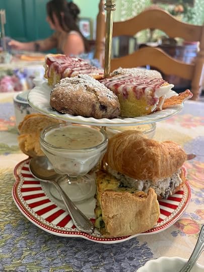 As always, I enjoyed seeing the pretty place settings—those vintage green thumbprint goblets were particularly lovely—as well as the decor of the tearoom itself. The tea we chose this time was Emperor's Fog, a tea blend with pineapple, papaya, and guava.