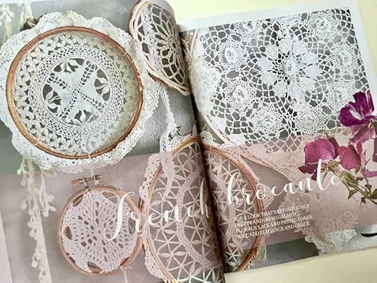 This one is about as thick as the old Sears Christmas catalog, and even though it was $29.95, I thought it was one of the loveliest publications I've come across in ages, so I got copies for both me and my friend, and I was glad I did because she has thoroughly enjoyed it. First, I loved how they "framed" old doilies in embroidery hoops. Wouldn’t that be fun (and thrifty) décor for a tea?