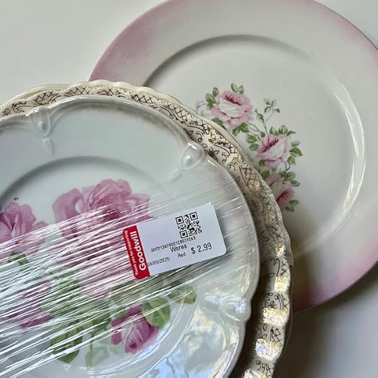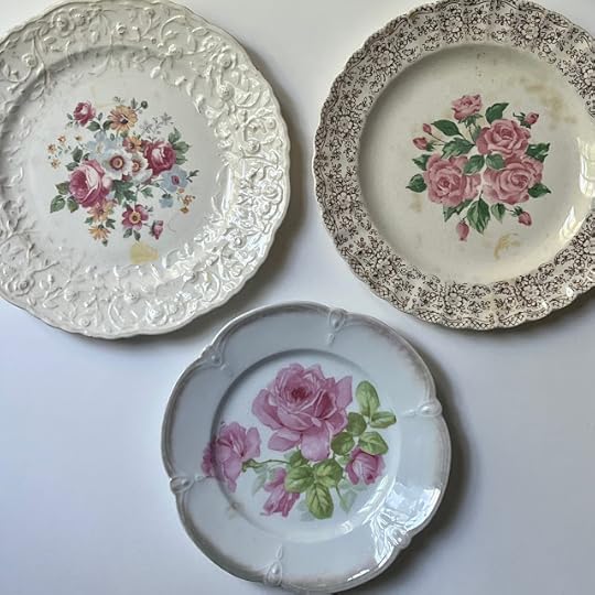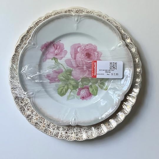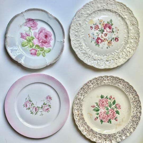 Yesterday, I was at a breakfast meeting along with an antique-store-vendor friend when I told her, “Yes, I agree that our thrift stores around here are crappy.” And I kid you not, one hour later, I was killing time at Goodwill, the only store I found open while I was waiting on Barnes & Noble to open, and ended up buying four gorgeous vintage plates with roses on them, grand total $5.98!