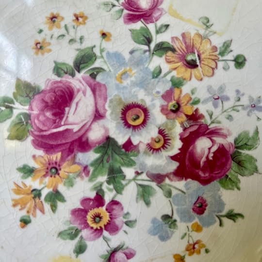 The two plates on the bottom of the stack had old, old sticky spots on them—probably from price stickers of yesteryear—but rubbing a little baking soda on the spots quickly wiped that away, so that’s a neat tip to use with a teacup or plate or anything that has sticky residue on it. (And baking soda is much less abrasive than scouring powder.) And that’s how I picked a bouquet of roses yesterday! I’m planning to copy that “plate wall” trend very soon—my only question is which room—and these are perfect additions.