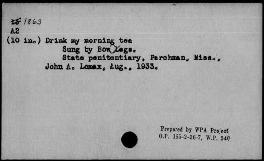 Boy, do I have some unique history to share today! You know how I'm always prowling the Library of Congress website for teatime images? I came across a new one this week, and I was quite puzzled by it at first. If you're in the vicinity of my age (61, to my utter amazement), you may be old enough to remember that pre-Google, there was this thing called "the card catalog" at the library, and that was where we used to look up all kinds of info. This card, with its little punch hole at the bottom, sure looks like something that was in a card catalog at one time. So "Drink my morning tea" (I noted that not all the words were capped here) was apparently sung by one "Bowlegs" at the state penitentiary in Parchman, Mississippi, in August 1933. At that point, I wasn't sure who John A. Lomax was, but I was intrigued that this was a Works Progress Administration (WAP) Project.