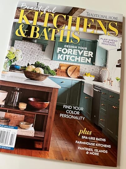 I'm starting to get serious about remodeling the kitchen, so I've been adding to my Pinterest board and collecting magazines about kitchen re-dos. Our kitchen was built in the nineties and looks like it. The cabinets need fresh paint and new hardware (at minimum), the appliances need upgrading, and that strawberry-and-grape wallpaper needs to retire. Though I've long dreamed of a pale-aqua kitchen, I'm currently lusting over a particular design featuring a lavender-and-navy-blue color palette, of all things. (See it here.) So naturally, I'm drawn to new magazine issues that deal with kitchen projects, like this one, Beautiful Kitchens & Baths from Traditional Home magazine.