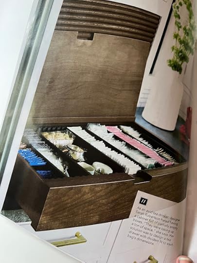 And I promise you that I was not looking for tea articles when I turned a page and read this: "As an avid tea drinker, Sarah Robertson hated having a cabinet full of partially empty tea boxes. 'They were taking up a ton of space,' she says. Her solution was to design a tea drawer with dividers fit to each bag's dimensions." Isn't that a great idea? I wish the article had included a photo of the tea drawer once it's closed and in place, but still, the idea is just smashing. My tea drawer would need to be deeper and have room for tea tins as well as tea bags, but if you're designing a custom piece anyway, I don't see why that couldn't work.