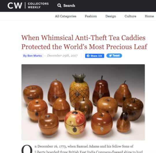Tea friend Diane M. sends me links to the most interesting pieces. She manages to come across so many unusual articles, images, and fun facts about teatime, and this week, she sent along a link to a Collectors Weekly article about tea caddies (a screen grab of which is shown here). I've always hoped to come across one of these genuine antique tea caddies, but I don't believe I've ever even laid eyes on one, much less purchased one.The article notes, "Because the price of tea was so dear in the 18th century, homemakers in the Old and New Worlds alike stored their green and black teas in special containers made of porcelain, sterling silver, and lead-lined wood, some of which were fitted with locks." Can you imagine having to keep your tea under lock and key? Thank goodness we don't have to do that today!