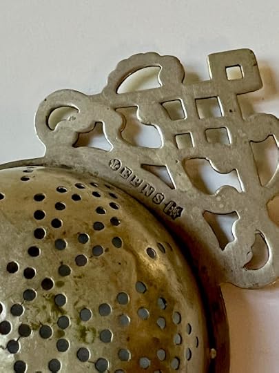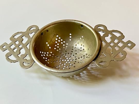 Because this thrift store supports several ministries, they get some unique donations, and someone had donated several old tea strainers. The others were chippy china, but this lightweight metal one caught my eye because it was obviously well loved …