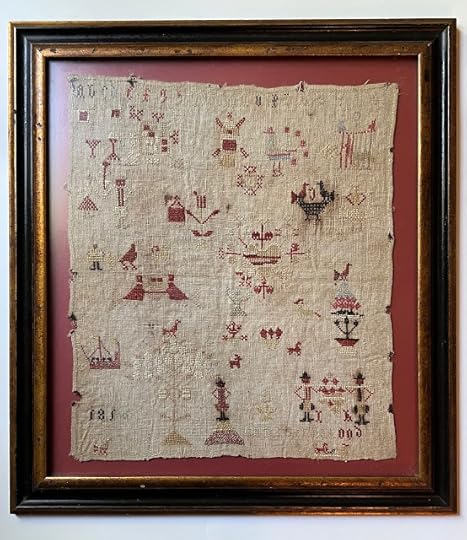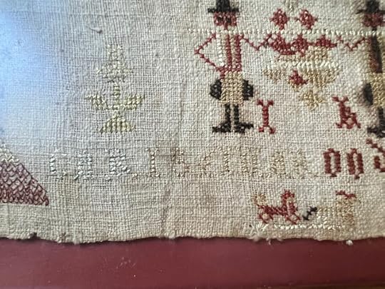 Some of you may remember that a few weeks ago, I mentioned that I've gotten into cross-stitch again. Well, this particular thrift store has added a "vintage" section featuring more upscale items donated by supporters of the store's ministry, and many items weren't yet priced. I've been checking on this sampler for months, but they still hadn't priced it. I figured I probably couldn't afford it anyway since genuine antique samplers usually have pretty hefty price tags. I mentioned to the nice man who runs the store that I sure hoped they would price it one day, and I told him that I stitch samplers myself. That interested him, and he told me that he'd recently sold another sampler for $250. ("Ah," I thought. "Fair price, I'm sure.") But then he surprised me by saying, "You know, since you make samplers, look, I'm really big on items going to the right person. No pressure or anything, but if you want it today, I'll sell it to you for $50." I couldn't pay for that sampler fast enough!